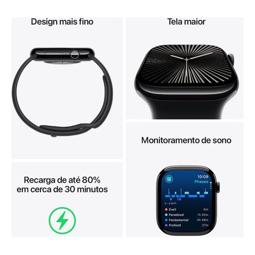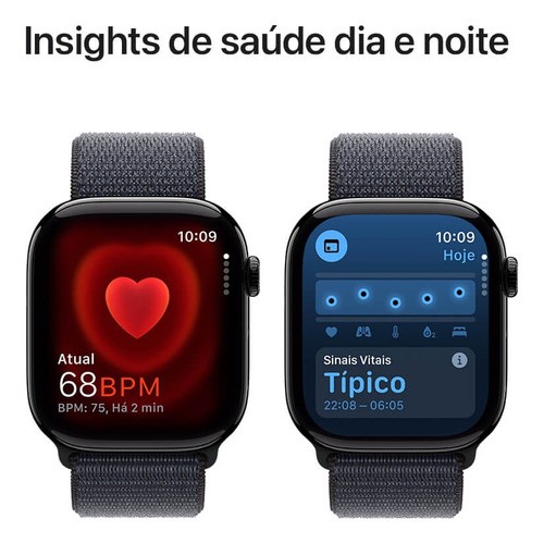 Saúde e Bem-Estar: Monitore sua saúde de forma mais completa com recursos como ECG*, monitoramento de ritmo cardíaco irregular**, e acompanhamento de ciclo menstrual. O Apple Watch Series 10 ainda conta com a Detecção de Queda e SOS de Emergência***, para maior segurança em todas as situações.
